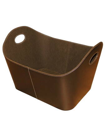 Holzkorb aus Kunstleder braun mit weissen Ziernähten, mit Grifflöchern, innen mit Vlies ausgekleidet. Vielseitig verwendbar zum Beispiel auch als Zeitungs- oder Spielzeugkorb.