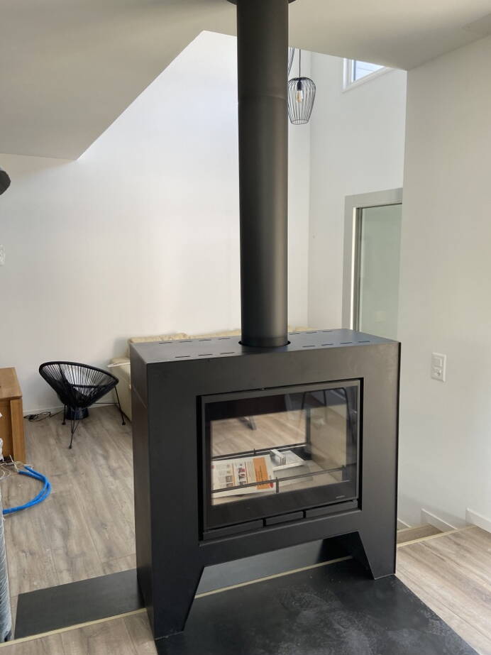 Der Jules kann sehr gut freistehend inmitten eines Raumes platziert werden. Somit können Sie von zwei Seiten aus das Feuer betrachten. Die Feuerraumtüren können auf beiden Seiten geöffnet werden. Der Kamin hat eine hohe Leistung und die Möglichkeit 50 cm grosse Scheite zu verbrennen.