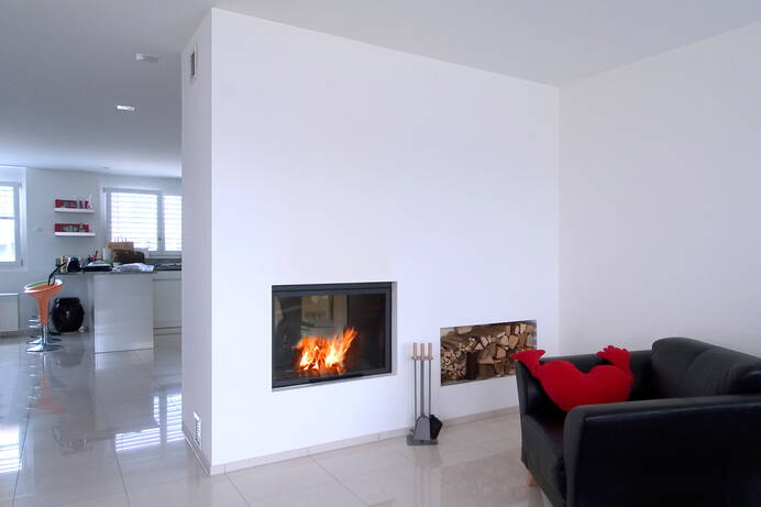 cheminée à 2 vitres (tunnel) avec rangement pour bois.